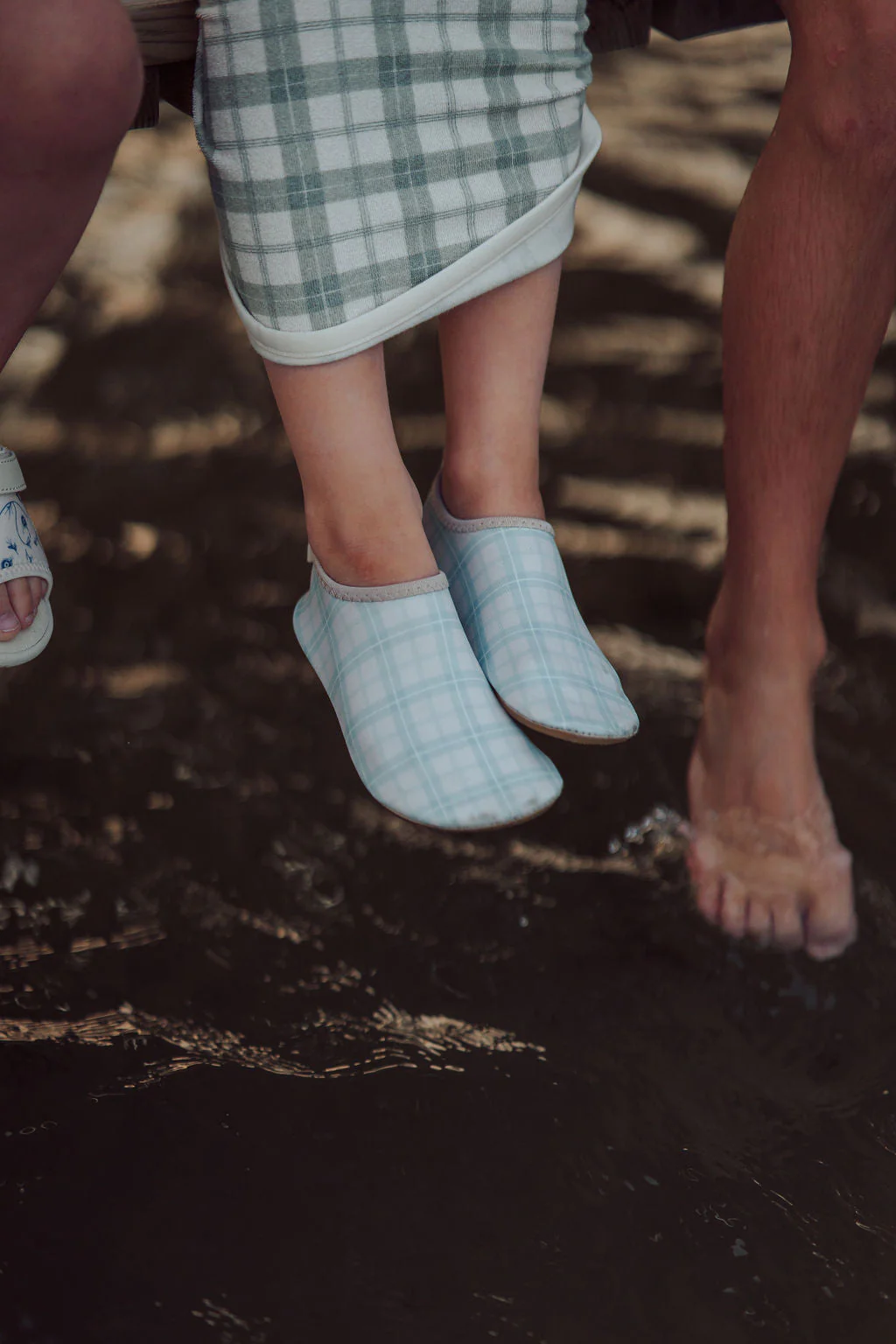 Met deze comfortabele waterschoentjes van Grech & Co in een retro groene ruit, glijdt je kleintje niet meer uit op een gladde (zwembad) vloer. Ze dragen fijn, zijn licht van gewicht en snel droog. Zie bij de foto's een overzicht van de maken.