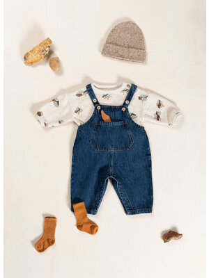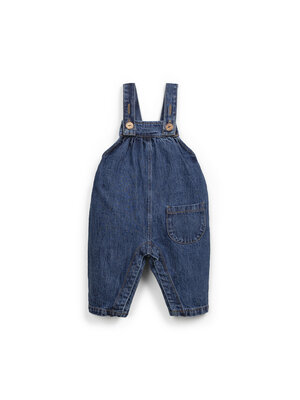 Stoere denim baby jumpsuit van Play Up in een donker blauwe wassing. Het model heeft verstelbare bandjes, een schattig rugdetail en een zakje aan de voorkant. Hij is gemaakt van organic cotton.