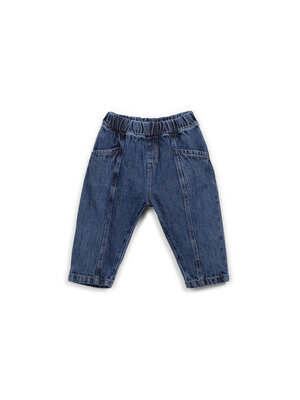 Stoere denim van Play Up in een donker blauwe wassing voor baby's tot en met 3 jaar. Het unisex model heeft een comfortabele elastische taille. Hij is gemaakt van organic cotton.
