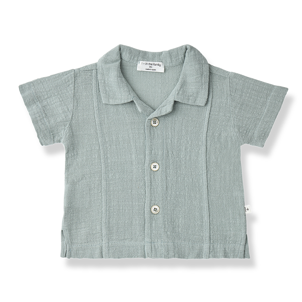Een groen baby shirt van 1 + in the family met korte mouwen. De blouse heeft een kraagje en knoopjes aan de voorkant. Hij is gemaakt van een luchtige organic cotton. One more in the family valt iets kleiner dan normaal. Zie onderaan de pagina een overzicht van de maten.