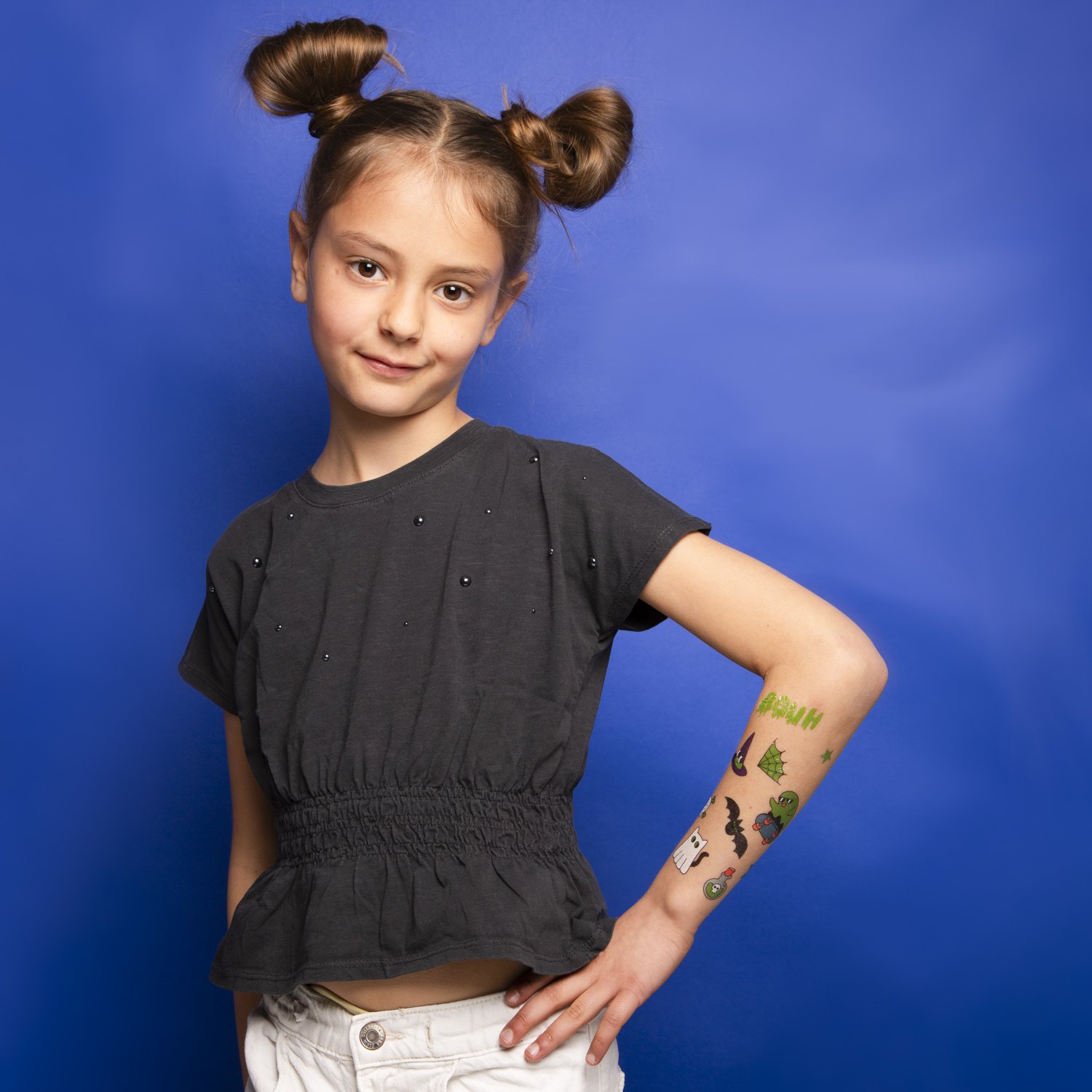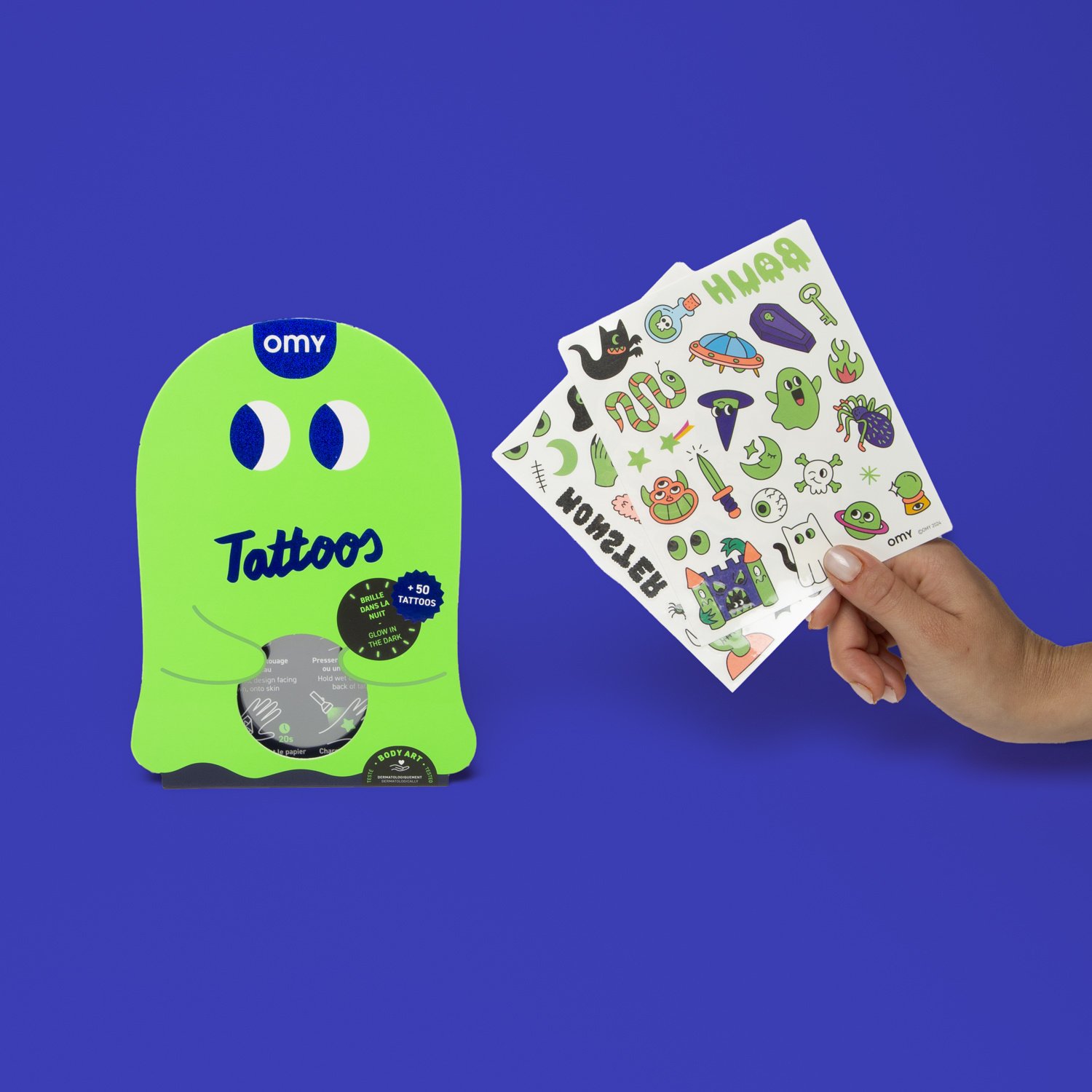 Hoe cool zijn deze tattoos van OMY in een spannend glow-in-the-dark thema? De 2 vellen staan vol met 50 vrolijke plaatjes met gekleurde, fluoriserende en gouden details. Ze zijn makkelijk te plakken, blijven goed zitten en zijn dermatologisch getest. Ook leuk als cadeau! Geschikt voor een leeftijd vanaf 3 jaar.