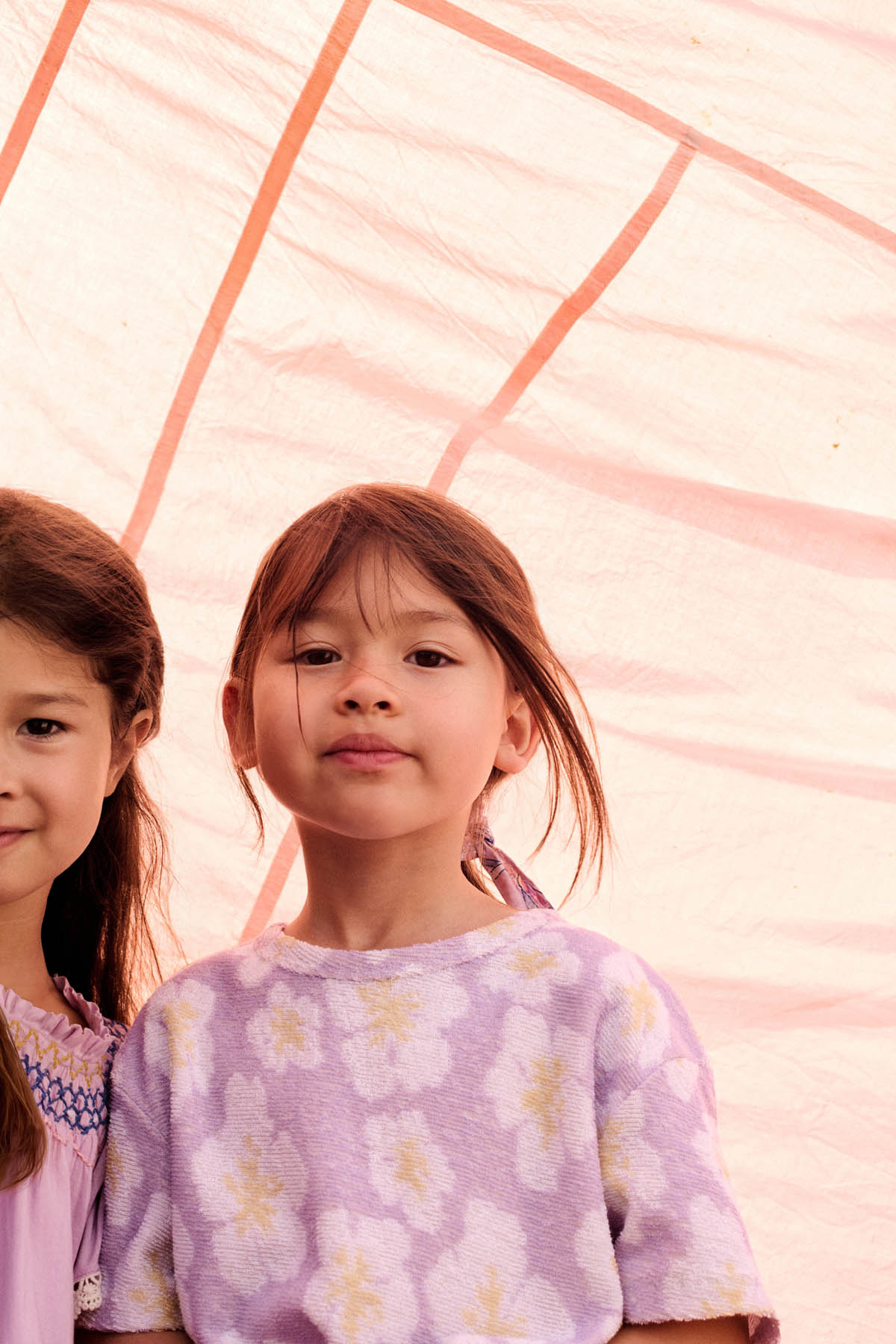 Toffe korte badstof top van Louise Misha in een licht paarse bloemen print. Het model heeft een gekruist rugdetail en korte mouwen. Er is ook een bijpassend broekje. Hij is gemaakt van organic cotton. Louise Misha valt klein tot normaal zie onderaan de pagina voor een overzicht van de maten.