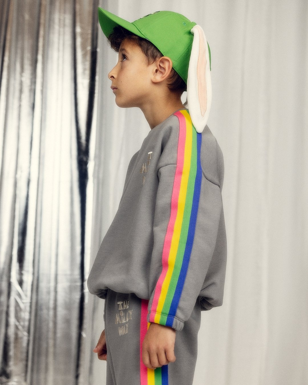 Sweatshirt van Mini Rodini in grijs met fel gekleurde strepen op de armen en een Milky Way opdruk aan de voorkant. De trui heeft een relaxte pasvorm, een ronde hals, geribbelde boorden en een elastische tailleband. Hij is gemaakt van 100% GOTS gecertificeerd organic cotton en er is ook een bijpassende broek. Het merk valt redelijk normaal tot wat groter, zie onderaan de pagina voor een overzicht van de maten.