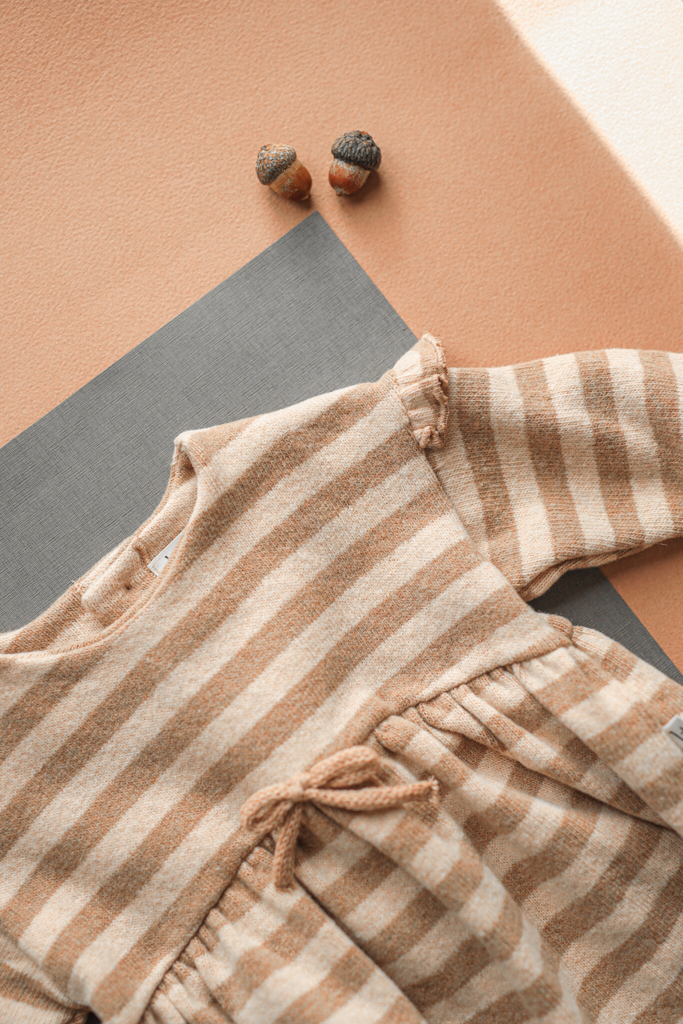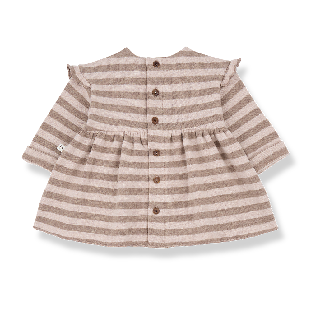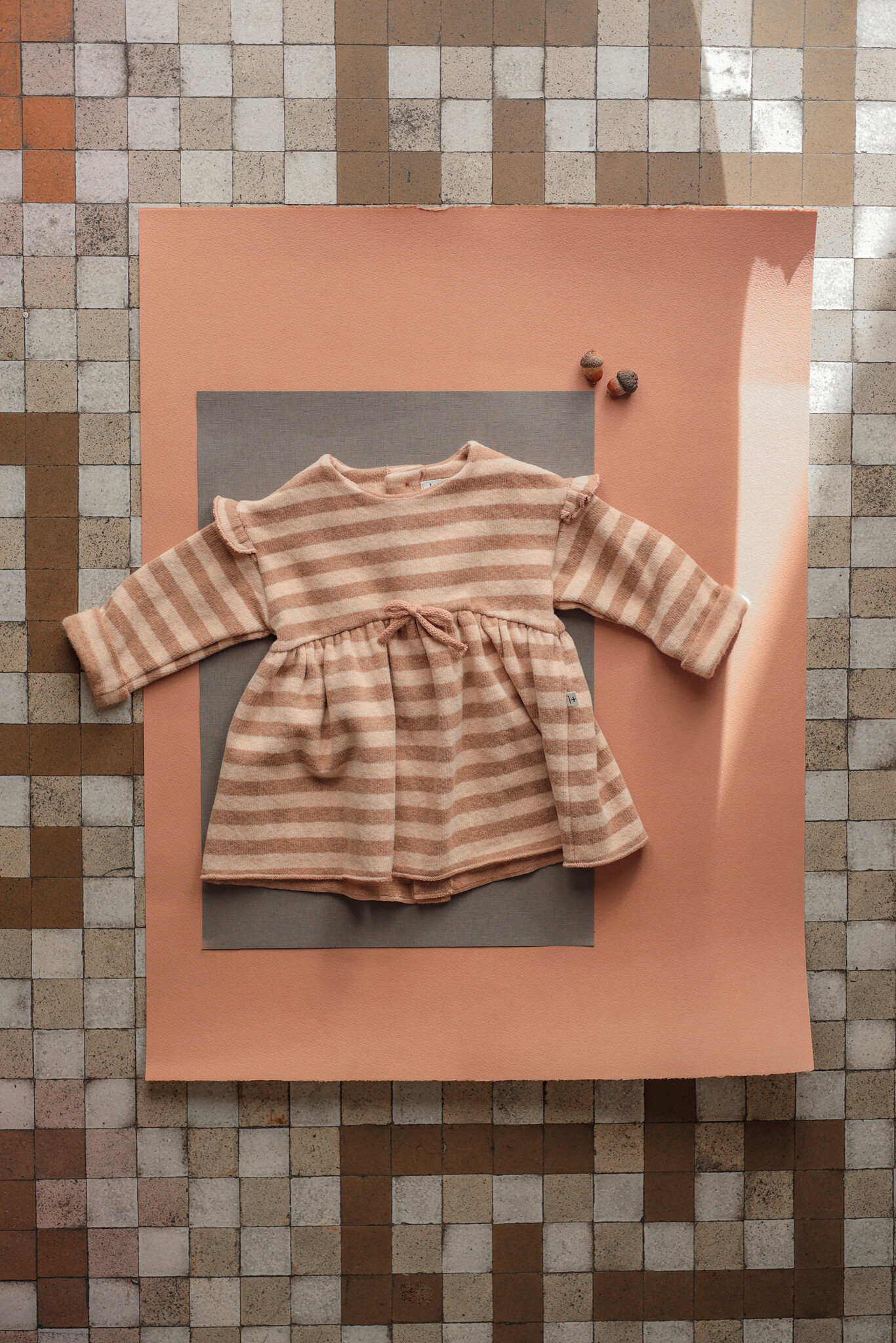 Heerlijk zacht baby jurkje van 1+ in the family in een prachtige roze streep. Het uitlopende model heeft een ronde hals, ruffle details bij schouders en een docaratief strikje. Hij is gemaakt van een warme organic cotton fleece. Lees meer