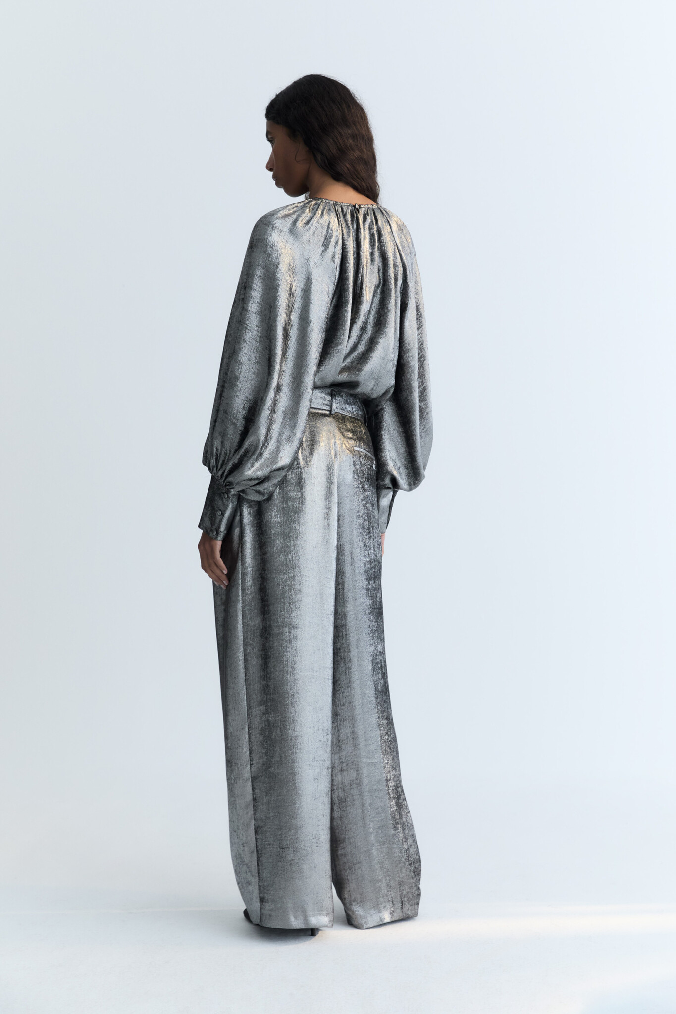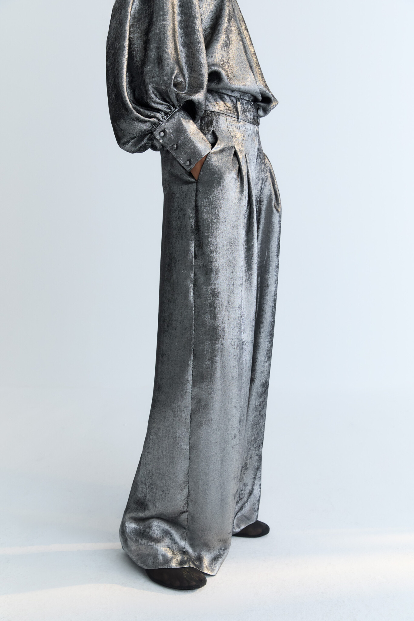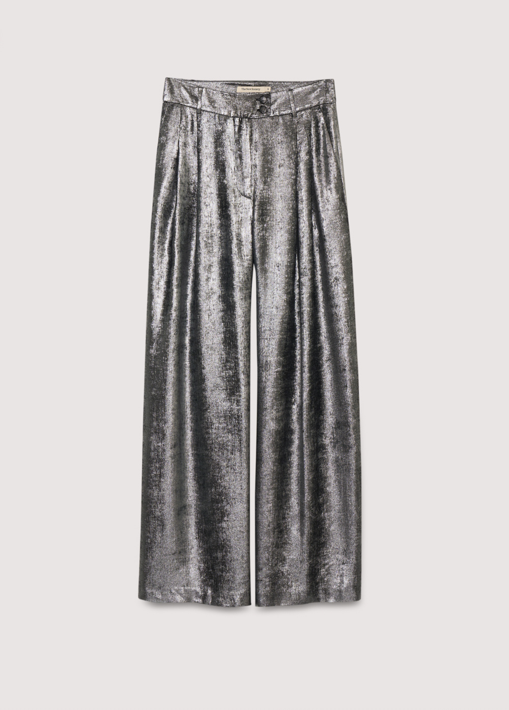 Elegante feestelijke broek van The New Society voor dames, uitgevoerd in glimmend zilver. Het wijde model heeft stijlvolle plooien en een onzichtbare sluiting aan de voorkant. De pantalon heeft wijde pijpen en zakken aan de zijkant. Klassiek en comfortabel tegelijkertijd. Er is ook een bijpassende blouse! The New Society valt redelijk normaal tot iets groter voor dames, het model is 176 en draagt een S.