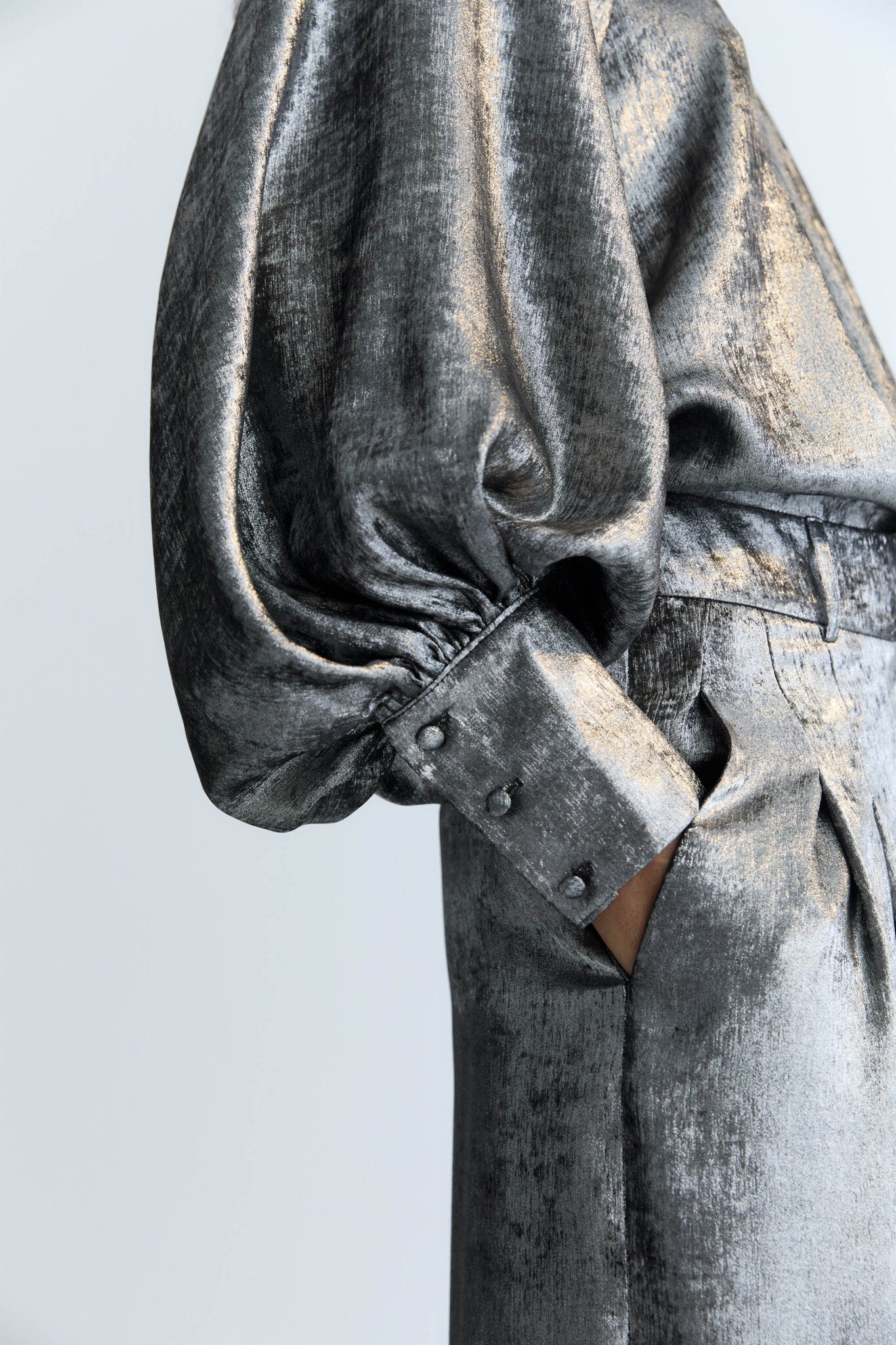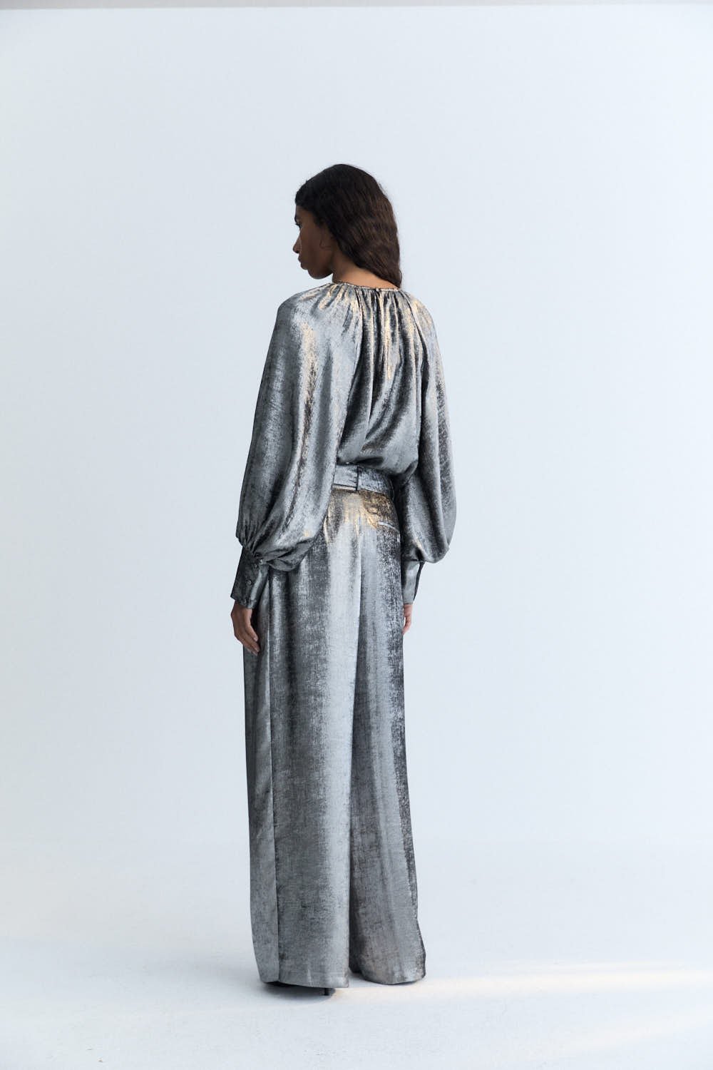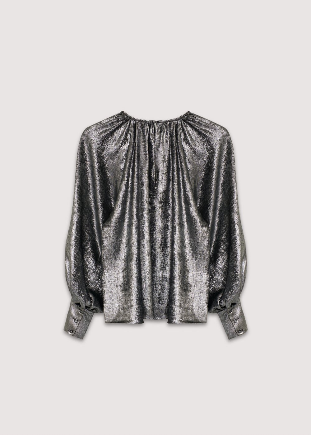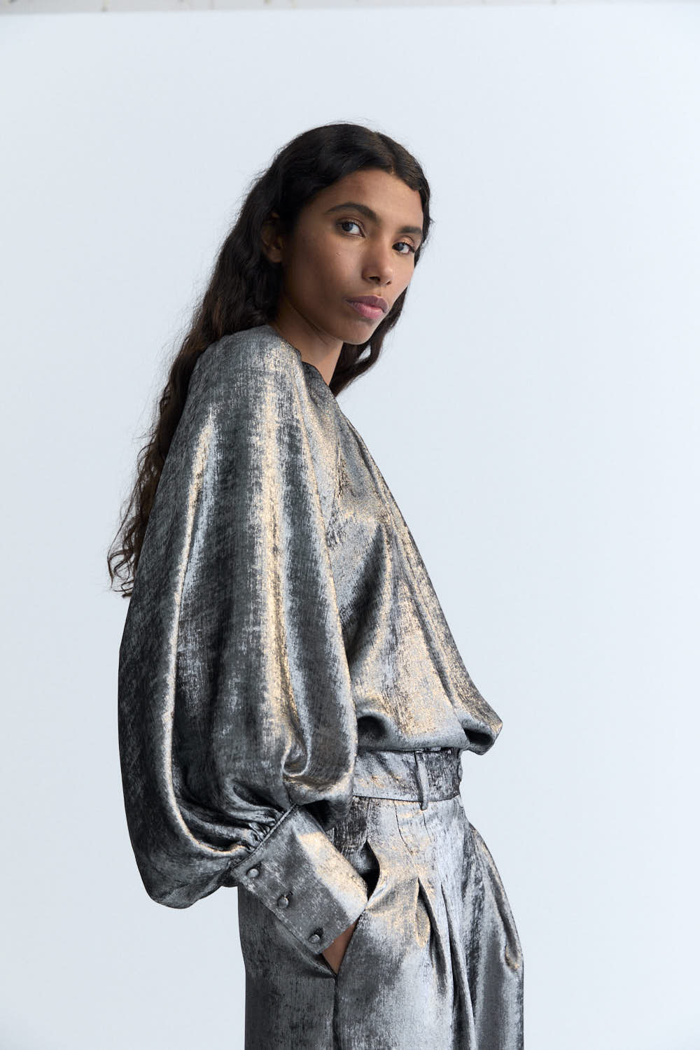 Elegante feestelijke blouse van The New Society voor dames, uitgevoerd in glimmend zilver. Het wijde model heeft een ronde hals, gepofte mouwen en gesmokte details. Stijlvol & comfortabel! Lees meer