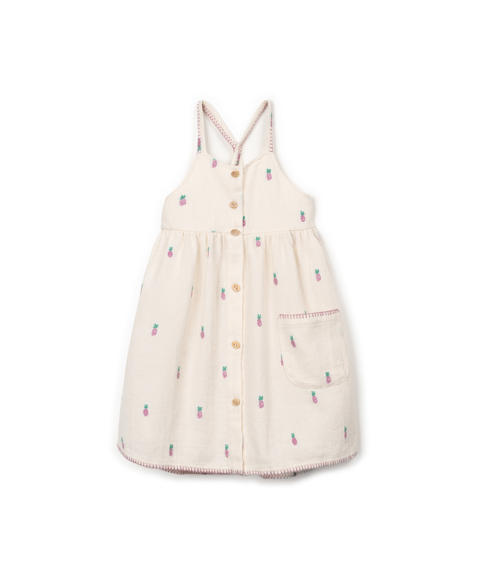 Zomers jurkje van Play Up met een geborduurde ananas print. Het uitlopende model heeft dunne bandjes die kruisen op de rug, knoopjes aan de voorkant en een decoratief zakje. Hij is gemaakt van organic cotton. Lees meer