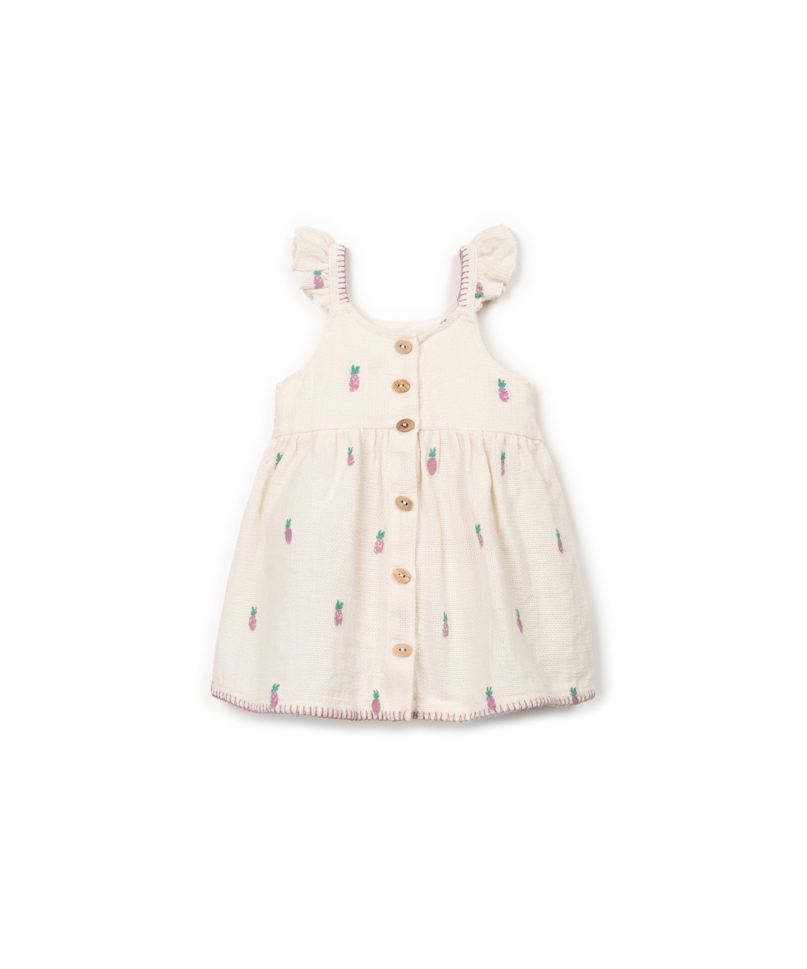 Lief baby jurkje van Play Up met een geborduurde ananas print. Het uitlopende model heeft dunne bandjes met ruffle details en knoopjes aan de voorkant. Hij is gemaakt van organic cotton. Lees meer