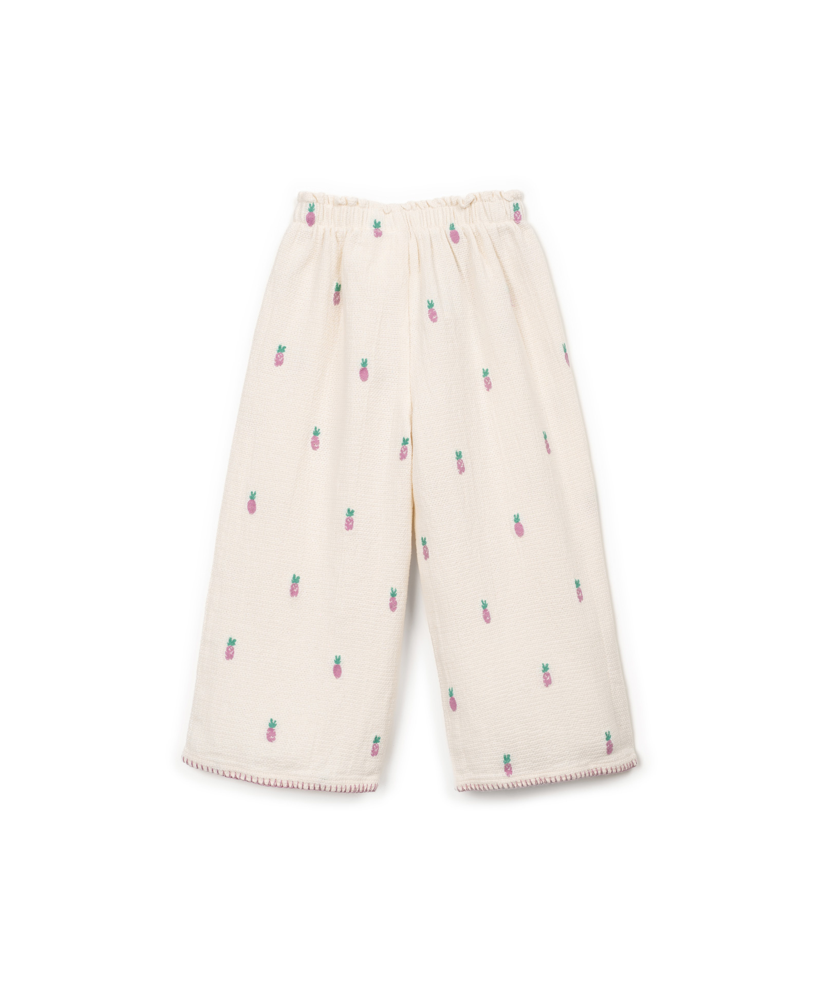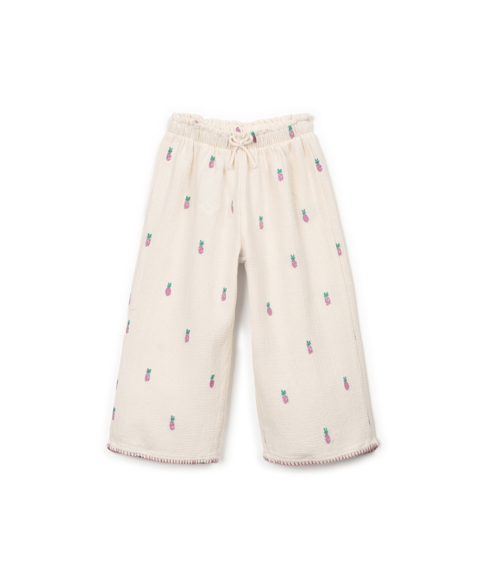 Geweven broek van Play Up met een geborduurde ananas print. Het wijde model heeft een comfortabele elastische taille met decoratief koordje. Er is ook een bijpassende top. Hij is gemaakt van organic cotton. Zie onderaan de pagina voor een overzicht van de maten.