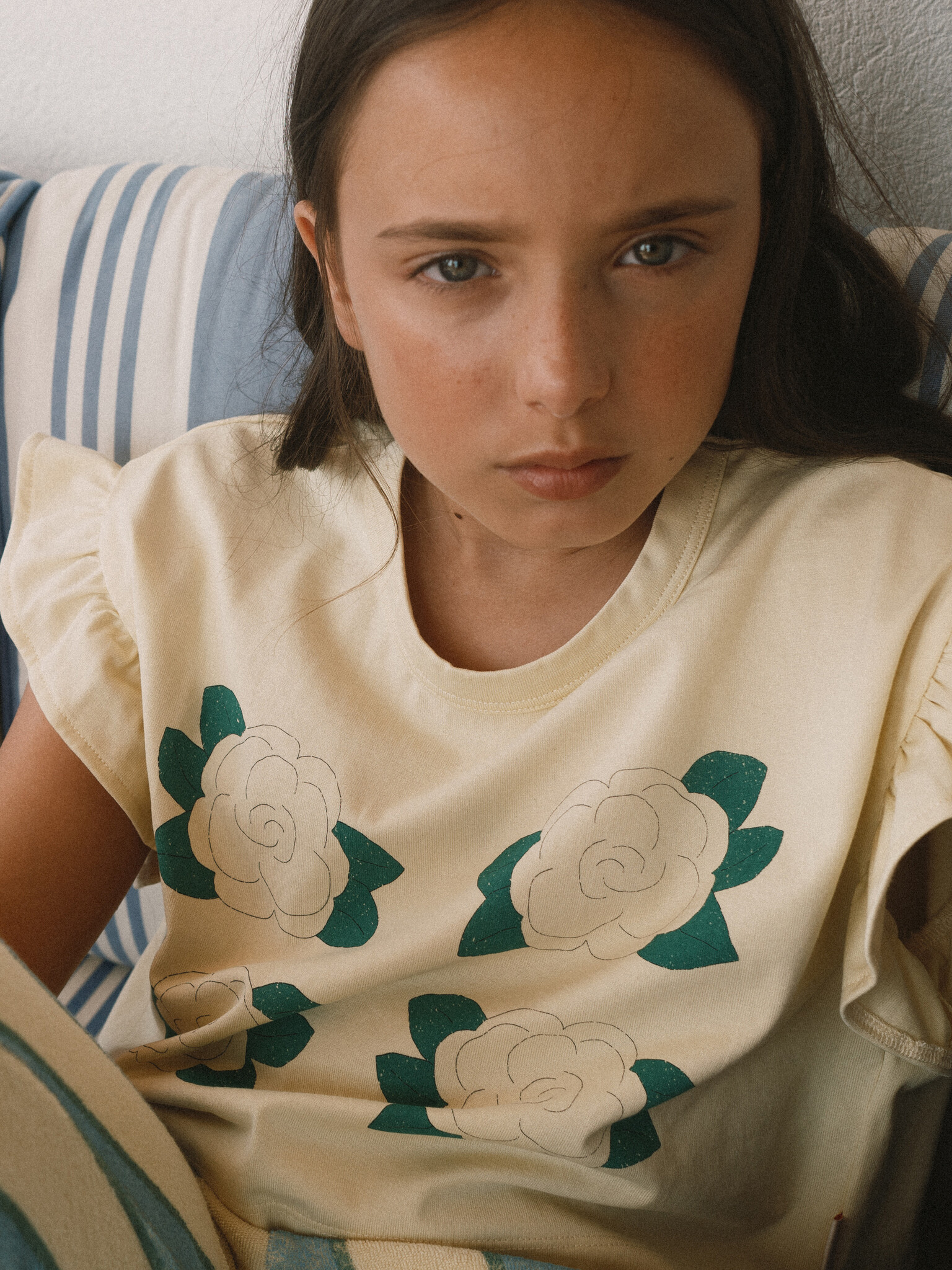 Zacht gele korte top van Tinycottons met bloemen opdruk. Het mouwloze shirt heeft een ronde hals en lichte frill mouwtjes. Hij is gemaakt van een heerlijk zachte organic cotton.