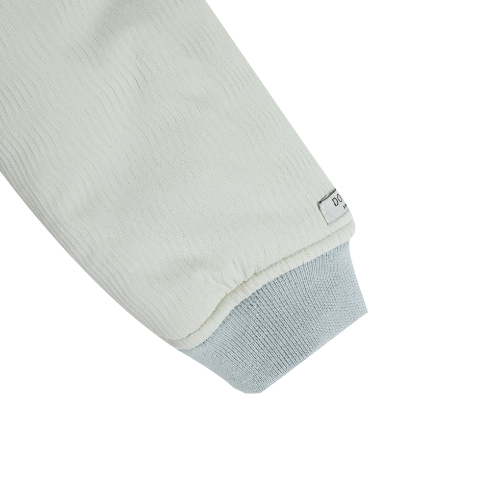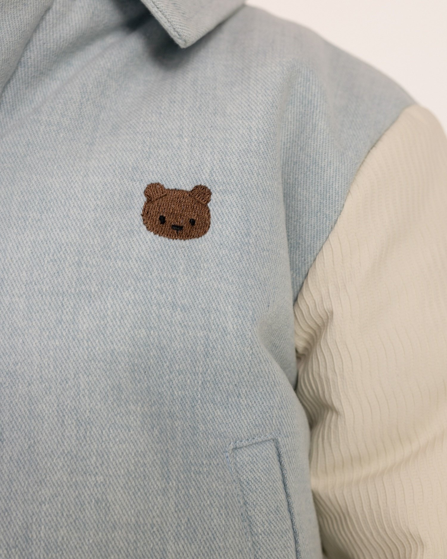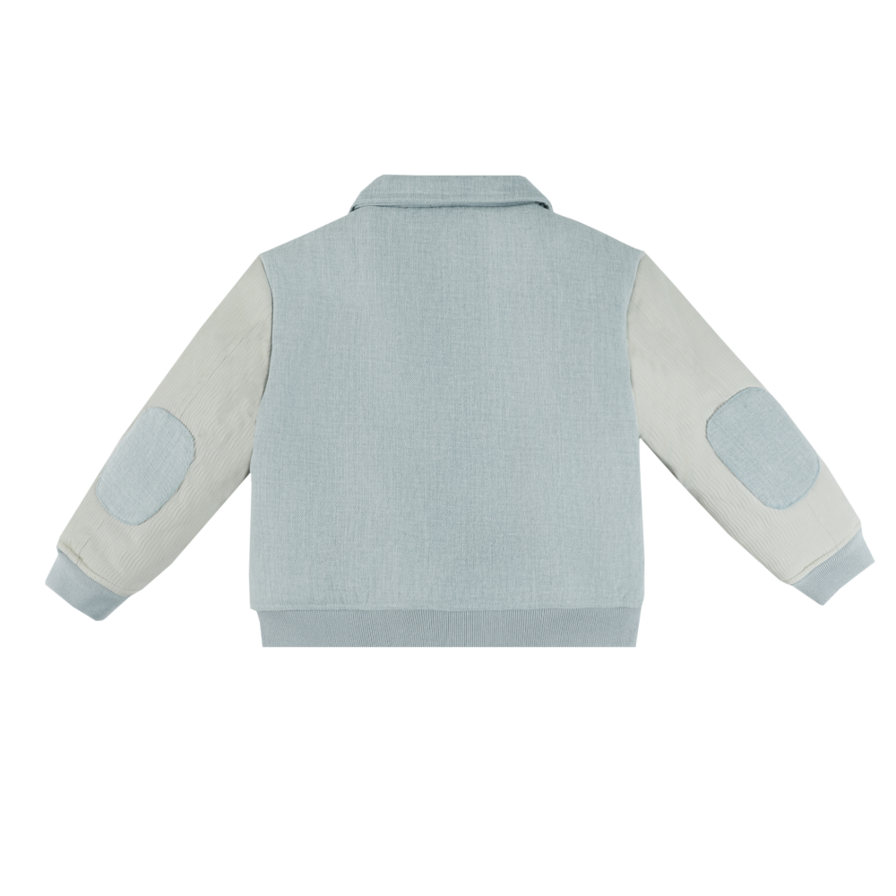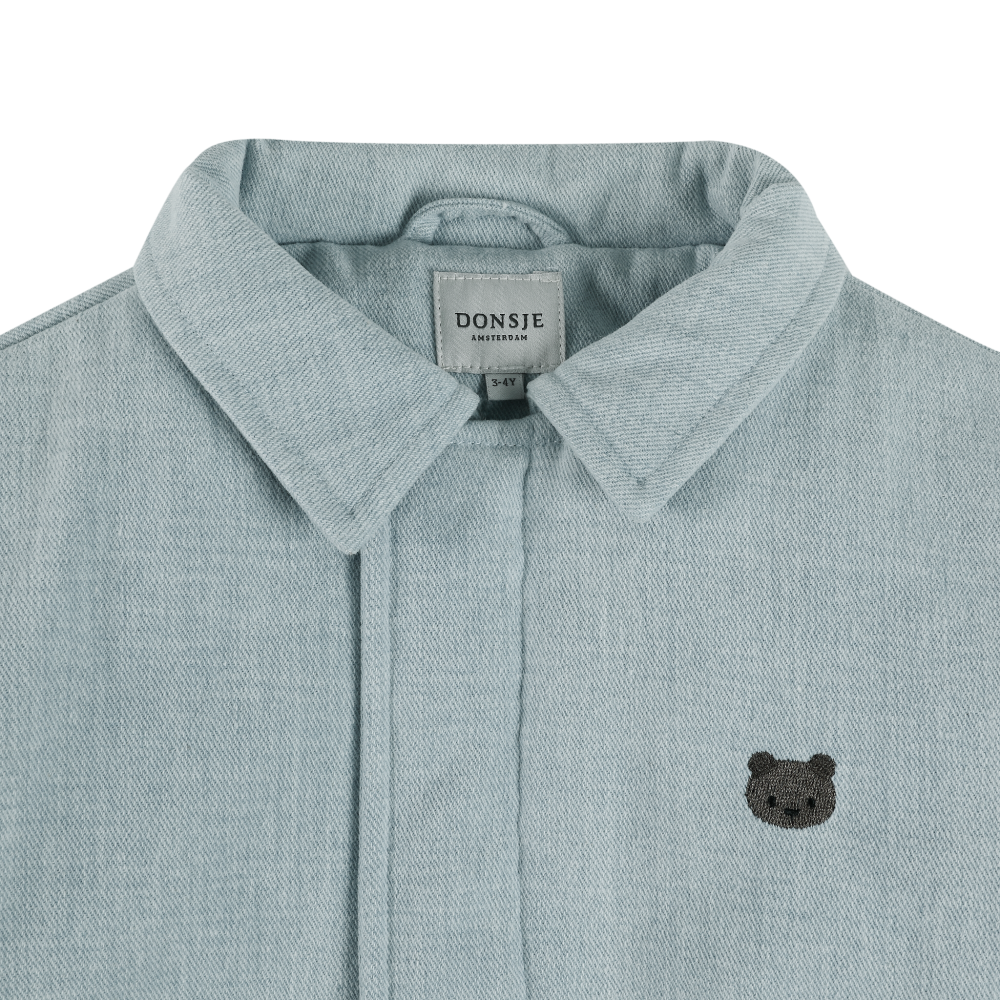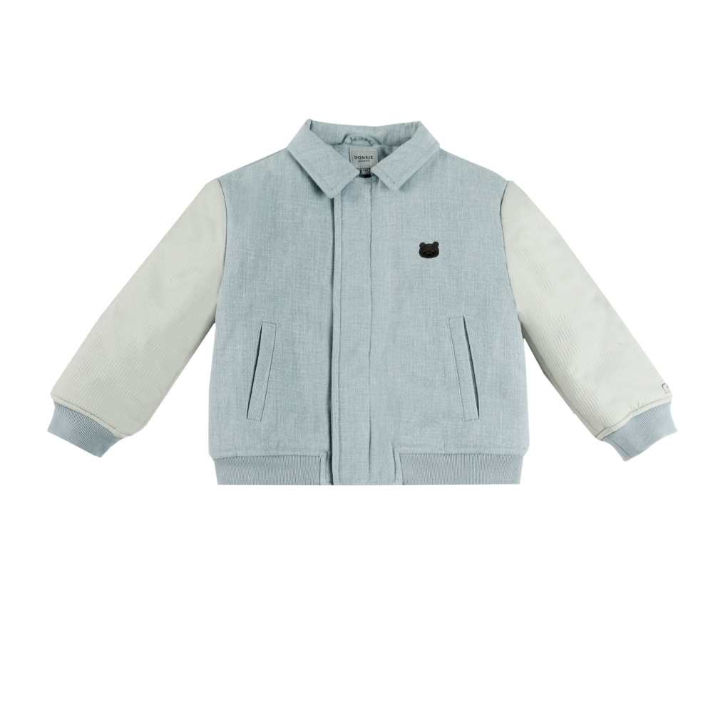 Stoer denim jasje met kraagje van Donsje in een licht blauwe kleur. Het korte bomber model is gevoerd, heeft contrasterene lichte mouwen en een beren opdruk aan de voorkant. Het jasje heeft zakken aan de zijkant en een ritssluiting met drukknopen. Donsje valt normaal op maat tot iets groter, zie onderaan de pagina een overzicht van de maten.